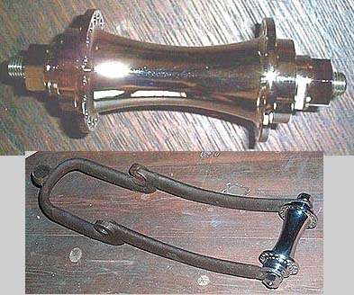 Excellent reproduction Corbin model 15 "hourglass" shaped front hubs for sale. 36 hole, 3.75" over cones, knock out style axles, use sealed insert bearings for low maintainence. Complete, beautifully nickel plated and ready to use: $300.00 includes shipping in U.S., shipping outside continental U.S. is extra, please ask. For orders or more information please contact Mike Carver mcarver11@attbi.com Thanks!