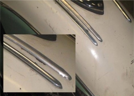 Front fender trim is 17 inches long and would take that as splice can be concealed beneath iron luggage rack front/rear castings. Trim can be dented or semi-crusty, but unfortunately not completely flat as not as malleable as modern aluminum repro and thus splits when attempting repair. Pic below shows original top trim on left compared to repro.