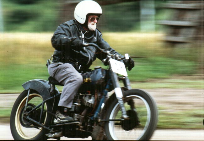 Hey Co, I think you and I are travelling in the same lanes today. I met Walt Heally everytime he visited my good friend Bert Bentley in Winnipeg when he came to visit Bert. They both rode together in a Calgary motorcycle club in the 30's. Bert was a high ranking officer in WW2 and settled in Winnipeg with a good job as head of the emergency measures for the province. Walt would come for a visit with his friend in a sidecar outfit and was well up in years. In the early 90's my family and I drove to BC to the Cloverdale meet and to my good fortune Walt was the main attraction doing the burning wall trick with that old Indian. By the way he towed it there with the sidecar outfit and had removed the scout front wheel and then attached the Indian. What a guy. The wall was burning furiously and the field was sort of sand and he wiped out right in the middle of the flaming wall. He was rescued , stood up and waved without missing a beat. We had a nice chat after. I miss the old guys. Hey wait a minute ... Now I are one!!!