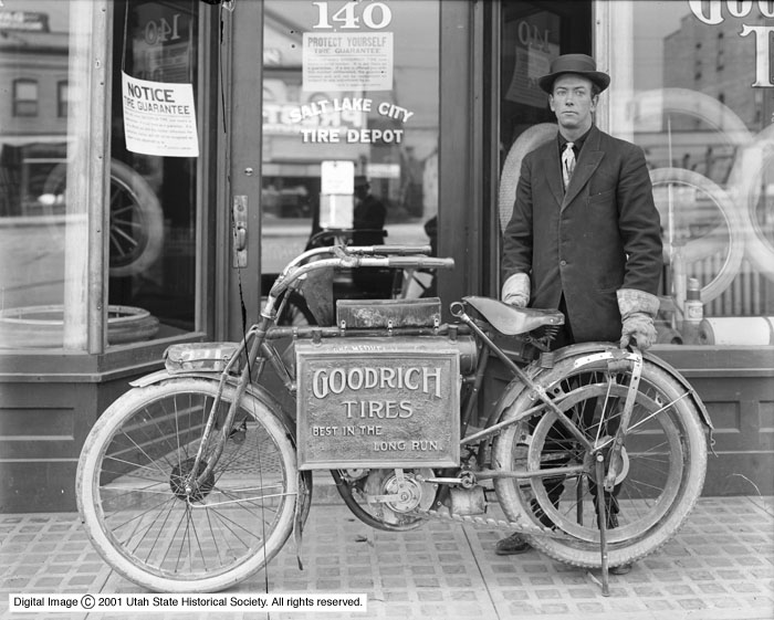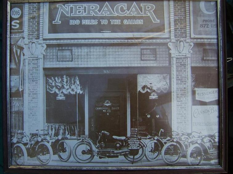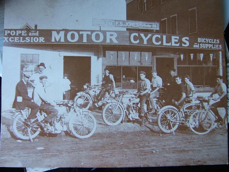 This exposure on a silver plate glass negative (4x5?)would have been so cool to see in color. You can just see the flying Merk crest on tank. Would have been nice to see the pennant on handle bars also. They must have just taken that sign (copper pressed) from inside the shop and hung it on the bike. If you look carefully in the reflection of the storefront glass you see the photographer, the street scape with no people. The dead pan expression on the guys face is great also. Yup- that bike has seen some serious action. It's a beautiful shot. Truly has captured a moment in time. looks like the neg plate must have cracked and was re printed from that as you can see a black line -door handle.