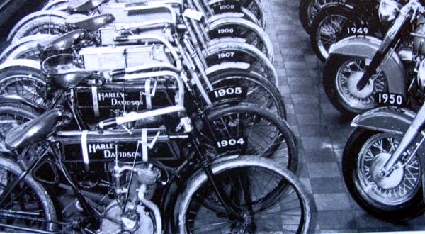 • Here's the circa 1950 photo of the Factory bike collection. On the left are the earliest bikes and on the right the newest bikes. Since the newest is a shiny new 1950 Hydra-Glide that dates that photo for us.