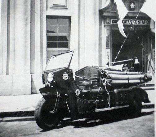 Check it out....An old Motorcycle Fire Engine Rig. Looks to be in a foreign country. Anyone ever see this type bike?? What is it...Year and make??