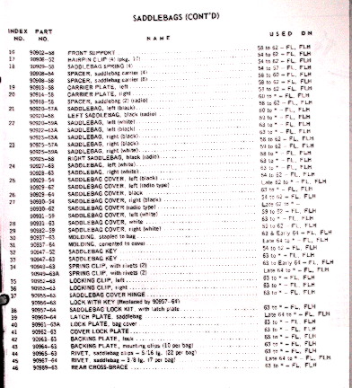 I thought I would throw this out on this forum, because I need a quick answer on this. I know the fiberglass bags started in 63, and they had the seal stapled to the bags. Is that the only year they had the slight step on the inside, by the mounts? ALso, am I right whaen I see a So am i right thinking the 63 bags, with the staples are the only yeart that had the step, anddifference in the lids of the 63 bags, and the later ones? I have a set with two different lids, I think. The 63(?) lid seems to be a little deeper around the rim, and the later one doesn't fit down on the 63 bags quite right. So am I right in thinking the 63 bags are the only year that had the step, along with the cheap clips on the bottom, and the lids are nactually different dimensions than the 64 through when the shovel bags switched to the tumbler lock? I am going on a long drive to return these bags I got tomorrow, because I don't need the 63 bags, and the guy has a set of the later ones I want. He didn't really know what he had until I got these, and discovered the difference. Anybody interesterd in two 63 bags, and one lid, in decent restorable shape, with locks that work? Speak now, or forever hold your pieces. I think he might have another early lid, but I will find that out tomorrow.