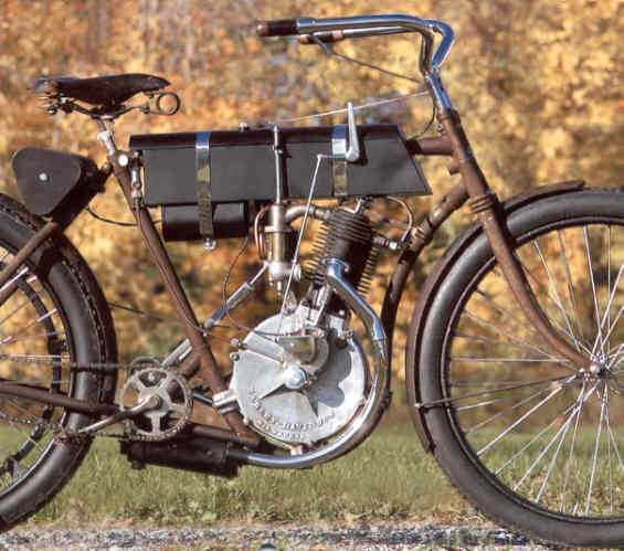 The first Serial Number One, (Mitchel bike), which used to be called the Lobby Bike, could be called a REPRESENTATION of the first 1904 prototype. BUT, it is different from the 'core' machine shown in the 1912 photo, because it has a DIFFERENT motor, DIFFERENT frame, DIFFERENT tanks, DIFFERENT front hub, DIFFERENT rear hub, handlebars..........and those are only the obvious details. In it's present form though, it is much closer in appearance to represent a 1905 machine, as it is compared to the photo on the inside back cover of the Spring 2001 AMCA issue.