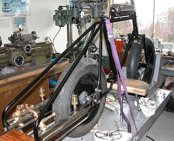 I've sent a couple of progress pictures to Adminguy to put up. The bike is now about 90% assembled with paint, plating, etc. I've also got the two coils and long mingling spark plugs pretty well dialed. If any of you are planning on attending that "concourse" in Half Moon Bay CA in a couple of weeks, I hope to have it there, but it won't be quite ready to jump any rivers yet.