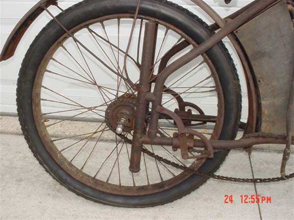 Here is a pic of the rear suspension. I also posted this as a 1909, but could be earlier? It is a single cylinder bike.Attached Files