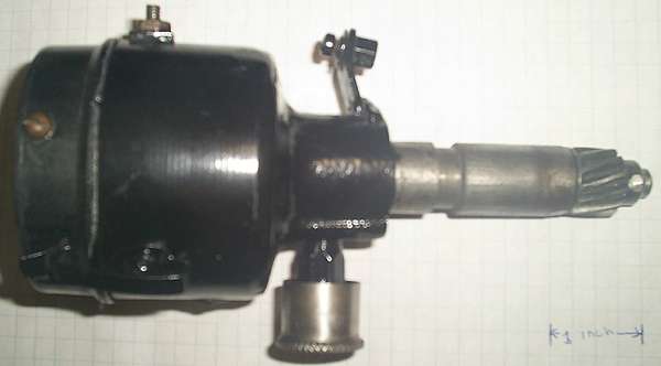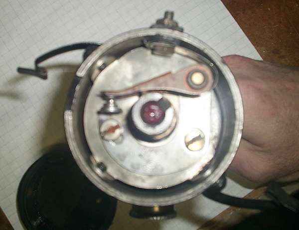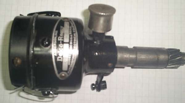 The "distributor" is very strange looking. The big grease cup resembles the one on my 1920 J. The cast body could be from an early unit, but the "Delco-Remy" tag I do not recognize. I have a feeling that the older Harley cut-off relays had only "REMY" on top, and that "Delco-Remy" came in the early 30:ies. The cap is of the 1927-up type. If the gears are of the right type (see earlier posts) it would probably work. It could be a later replacement part from Delco-Remy, as the points are of a modern design.