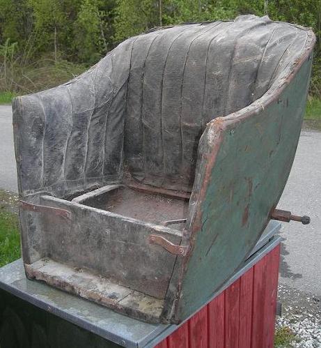Original green paint with blue pinstriping. Black leather-look upholstry on a wodden base in the back (at least part of it) and on the sides. Springs in the back-rest.