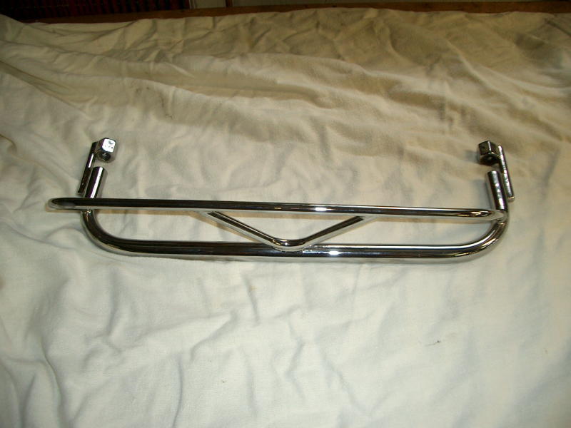 Back in 1987 I bought a 1961 FLH shriner type bike ,loaded with all kinds of goodies .It got stolen ,but I got most of it back in pieces .I only got one guard rail back ,this bike had bubble bags .I have several phots of bikes from this era with what appears to be the same guard rails ..This is a single chrome rail and and is bent inward at each end .It starts at the front of the bag about half way up ,and angles downward to about 3/4 of the way along the bag where it bends and goes under the bag .It's made of 3/4 inch OD tubing ,and on each end there is about a 3 "extention of 5/16th rod welded on to it .At the end of the rod is a large hexagon nut that has some thread inside it . Had I not seen photos of these guard rails I would certainly think it was homemade ,because of the nut ..Would Harley use a nut with the thread still visable , although not quite the same depth as a regular nut it has clearly been threaded at one time ,and maybe when it was chromed the threads got somewhat filled in .